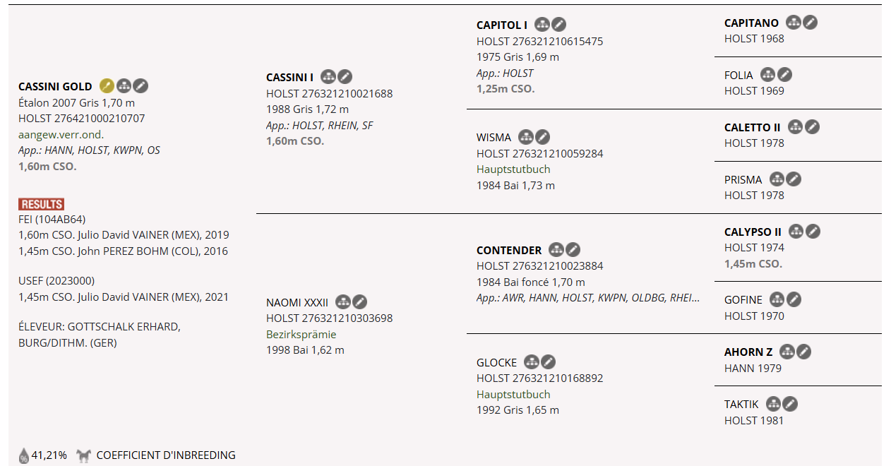 Son pedigree est également très intéressant avec les étalons fondateurs Cassini I, Contender et Ahorn Z. La lignée maternelle de Cassini Gold a également produit de nombreux chevaux de haut niveau en CSO ; Cassini Gold est le demi-frère de la brillante cheval de saut d'obstacle Caretina de Joter, qui a sauté au plus haut niveau avec Pius Schwizer et Edwina Tops-Alexander et s'est fait remarquer par ses talents de saut d'obstacles. De plus, Cassini Gold est également le demi-frère du performer Cambito van de Helle performant sur 1,60 m.