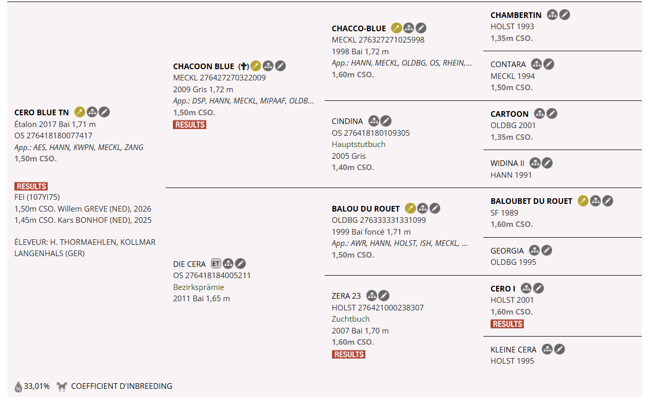 Il s'agit de la lignée maternelle holsteiner 3615 dans laquelle on retrouve le performer Crown Prince 2 et les étalons By Céra d'Ick, Special Céra du Maillet Z, Hommage de Luxe...