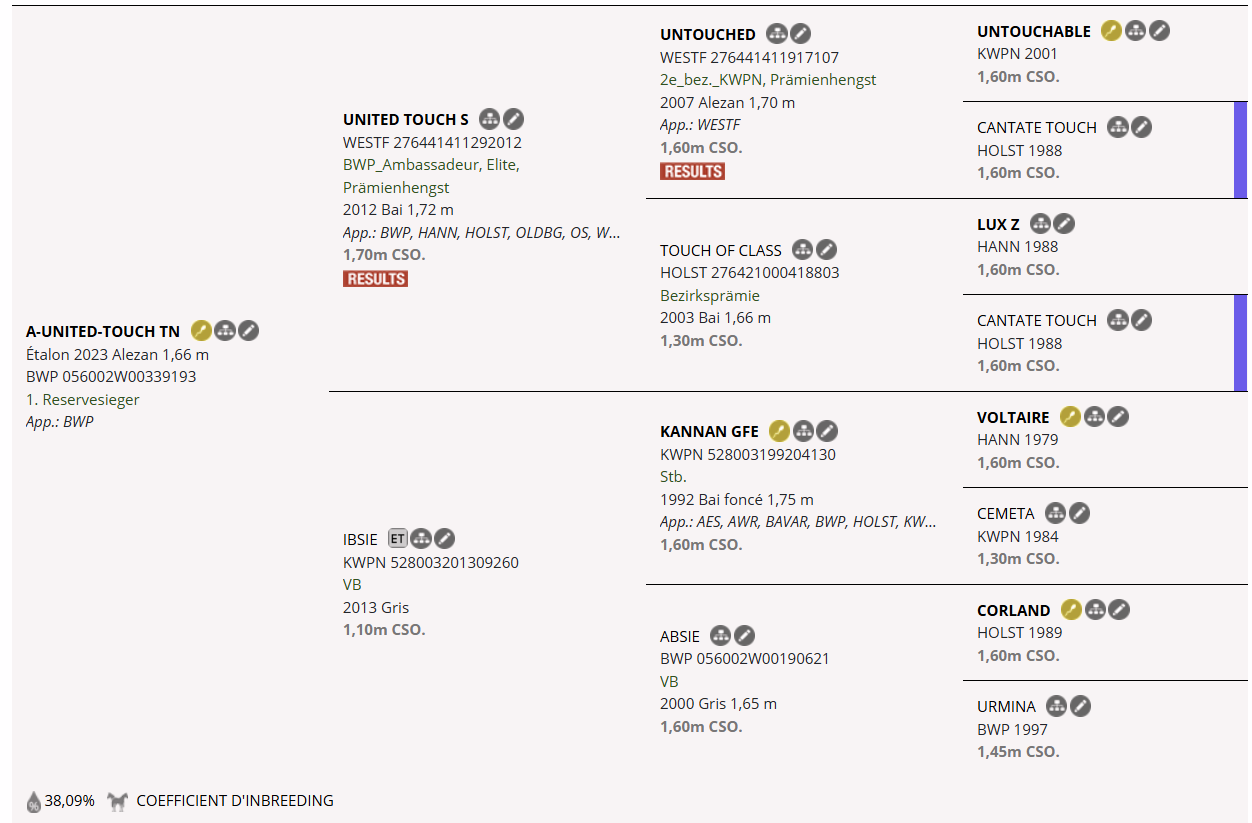 A United Touch (2023) combine des lignées aux performances exceptionnelles : United Touch S x Kannan x Corland x Heartbreaker. Ce pedigree unit le type moderne, la réactivité et la puissance de United Touch S avec la fiabilité éprouvée de Kannan, encore renforcées par le précieux sang de Corland dans la lignée maternelle.